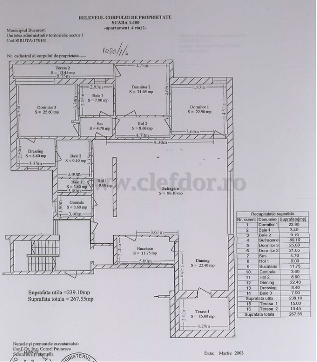 Are un living luminos si spatios (103mp) cu loc de luat masa si iesire pe terasa, grup sanitar, bucatarie echipata, dormitor matrimonial cu baie proprie si dressing, 2 dormitoare secundare cu bai proprii baie.